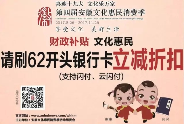 为喜迎党的十九大,支持鼓励城乡居民看书、看报、看戏、看电影、看电视基本文化消费,以“享受文化、美好生活”为主题的第四届安徽惠民消费季活动将于8月26日启动,并持续到11月26日。
