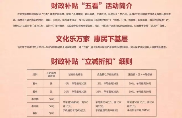 “五看”刷卡消费立减折扣优惠活动中,消费者可以在特约商户“购书、订报、购戏票、购电影票、订购电视节目”时,使用62开头银行卡刷卡消费,按设定补贴规则享受不同的“立减折扣”和折上折优惠,财政资金补完为止。