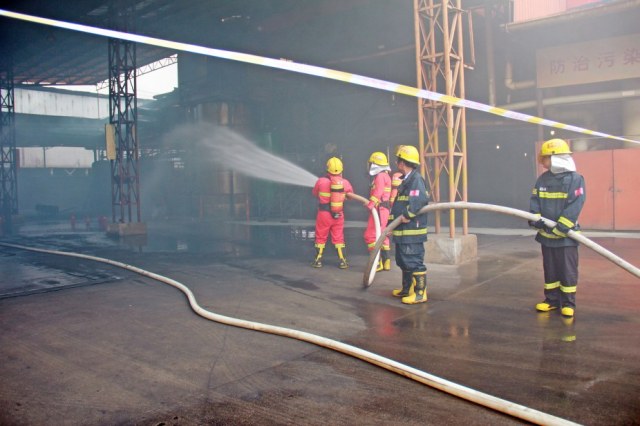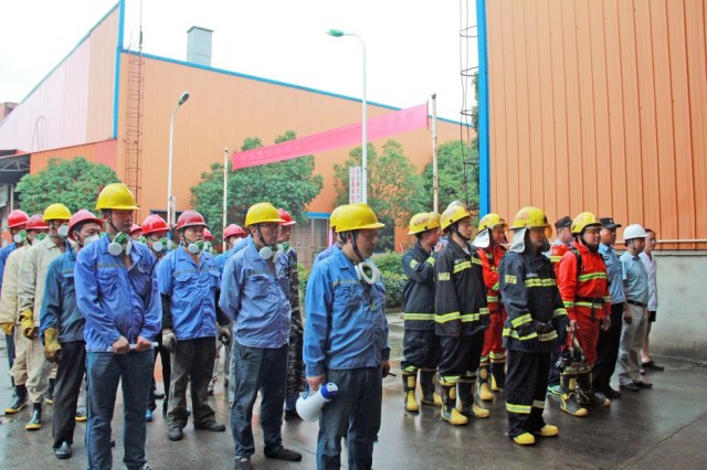 演练制定了详细的演练方案,并成立了应急救援指挥部,下设应急处置组、应急抢险救援组、警戒保卫组、后勤保障组、医疗救护组、信息报道组。现场模拟制造车间1号蒸发釜导物料管泄漏,引起火灾,一名员工未及时撤离现场,以此为背景进行应急救援演练。